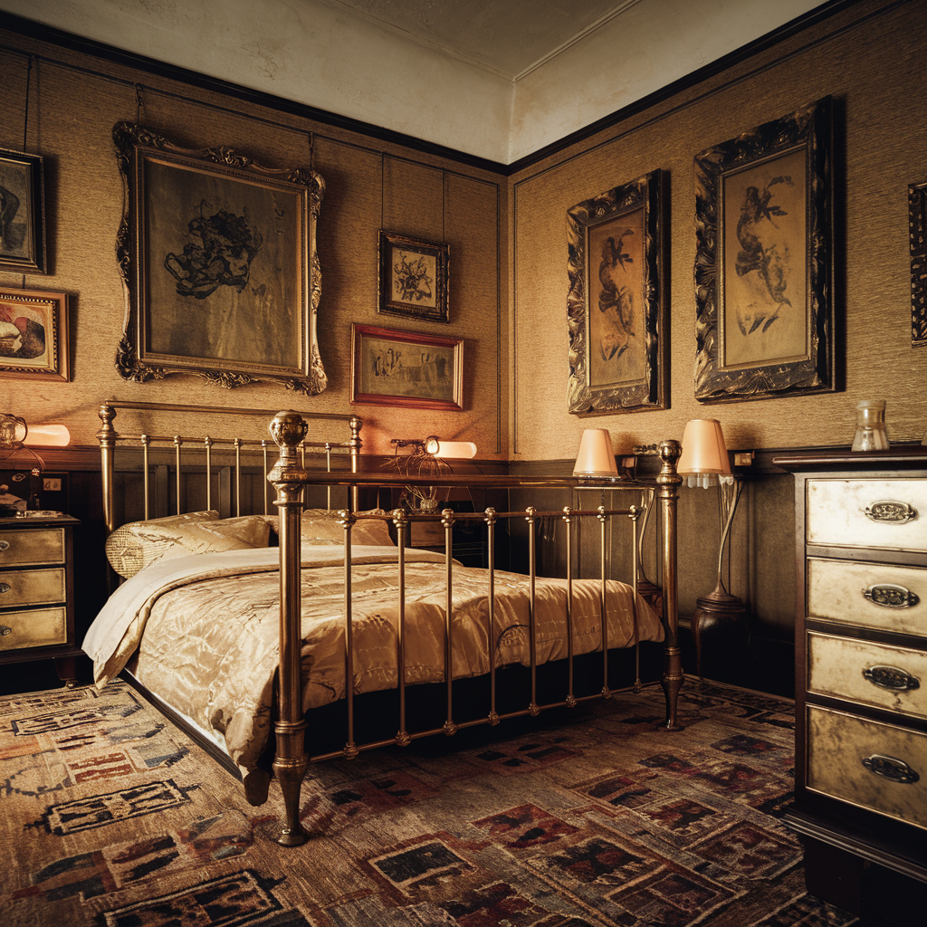 Metallic details infuse a vintage bedroom with understated luxury. A brass bed frame, gold-framed artwork, or antique drawer pulls bring a subtle touch of glamour. Mixing different finishes, like aged bronze and patinated brass, adds depth and visual interest.